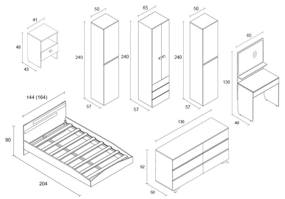 Кровать 1,4 или 1,6 (на выбор) с ортопедическим основанием и с механизмом подъема; тумба прикроватная; туалетный столик; комод; шкаф; пенал с полками; пенал со штангами